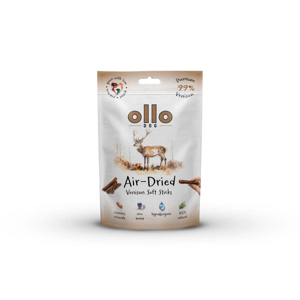 Ollo Air Dried Venison Sticks 80 g   Przysmaki dla psa Air Dried Venison Sticks 80 – hipoalergiczne, monobiałkowe paski z jelenia dla psa, 80 g to naturalne, hipoalergiczne, monobiałkowe smaczki z jelenia. Są delikatnie suszone powietrzem.  W 100% naturalny produkt, stworzony z myślą o psach wszystkich ras i w każdym wieku. Są miękkie i monobiałkowe, co jest niezwykle istotne dla psów z alergiami pokarmowymi oraz tych z wrażliwym żołądkiem.