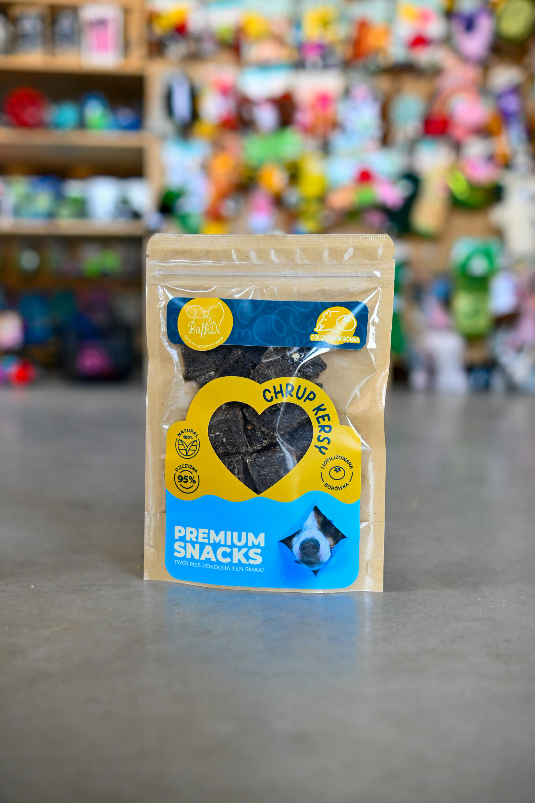 ChrupKersy – Dziczyzna z Liofilizowaną Borówką Amerykańską  Naturalne mięsne krakersy 95% dziczyzny + 5% borówki | Unikalna fuzja smaku i funkcjonalności   ChrupKersy od BaffiDi to absolutna nowość na rynku – pierwsze naturalne psie krakersy, w których połączyliśmy 95% czystej dziczyzny z liofilizowaną borówką amerykańską. Ta wyjątkowa, intensywna fuzja mięsa i owocu tworzy przysmak nie tylko smakowity, ale także funkcjonalny. To idealna propozycja dla opiekunów, którzy szukają naturalnych, zdrowych i niskokalorycznych smaczków dla psa, odpowiednich nawet dla alergików i psów o wrażliwych żołądkach. Mięsna forma chrupiących krakersów sprawia, że ChrupKersy są wygodne w podawaniu – idealne do treningu, w nagrodę oraz jako codzienny, wartościowy dodatek żywieniowy.   Dlaczego ChrupKersy są wyjątkowe?   ✔ 95% mięsa dziczyzny – pełnowartościowe, hipoalergiczne białko Dziczyzna to jedno z najzdrowszych mięs dla psa. Jest:
