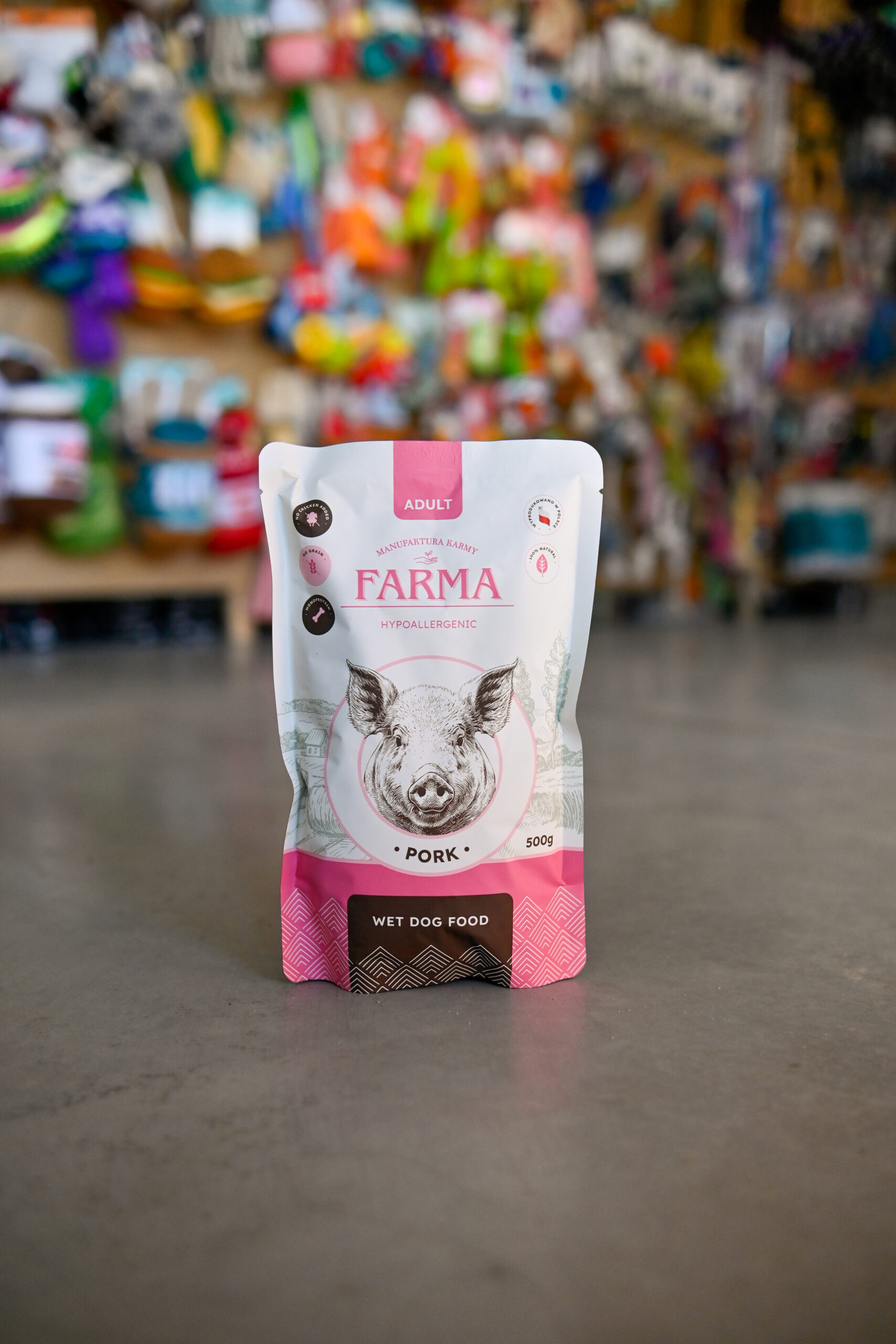 Pełnoporcjowa karma mokra dla dorosłych psów wszystkich ras, przygotowana na bazie świeżej wieprzowiny. Zawiera aż 92% mięsa i podrobów wieprzowych, co czyni ją wyjątkowo smakowitą i odżywczą. Uzupełniona o zdrowe dodatki, takie jak pietruszka, jabłko, spirulina czy olej z łososia, wspiera odporność, prawidłowe trawienie i piękną sierść.