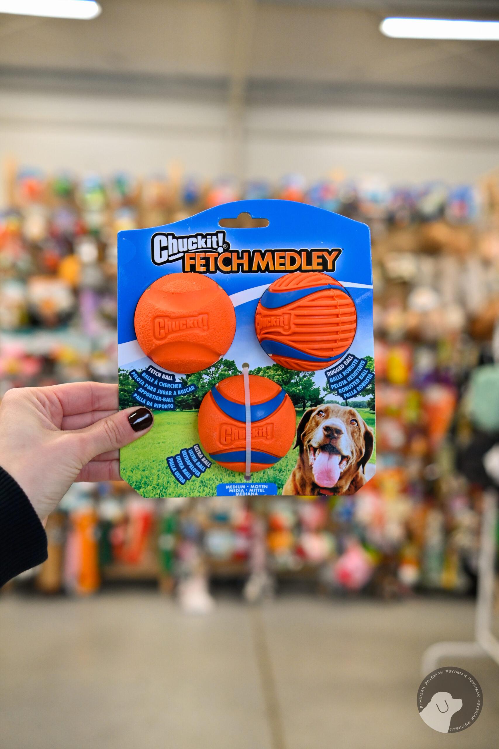 Fetch Medley medium III generacji to zestaw 3 różnych piłek Chuckit w rozmiarze M! W skład zestawu wchodzą flagowa piłka Chuckit – Ultra Ball – bardzo wytrzymała, unosząca się na wodzie, Fetch Ball – gumowa piłka w wysokim odbiciu oraz Rugged Ball – piłka o specjalnych krawędziach zapewniających mocny chwyt i wspomagających higienę dziąseł i zębów.