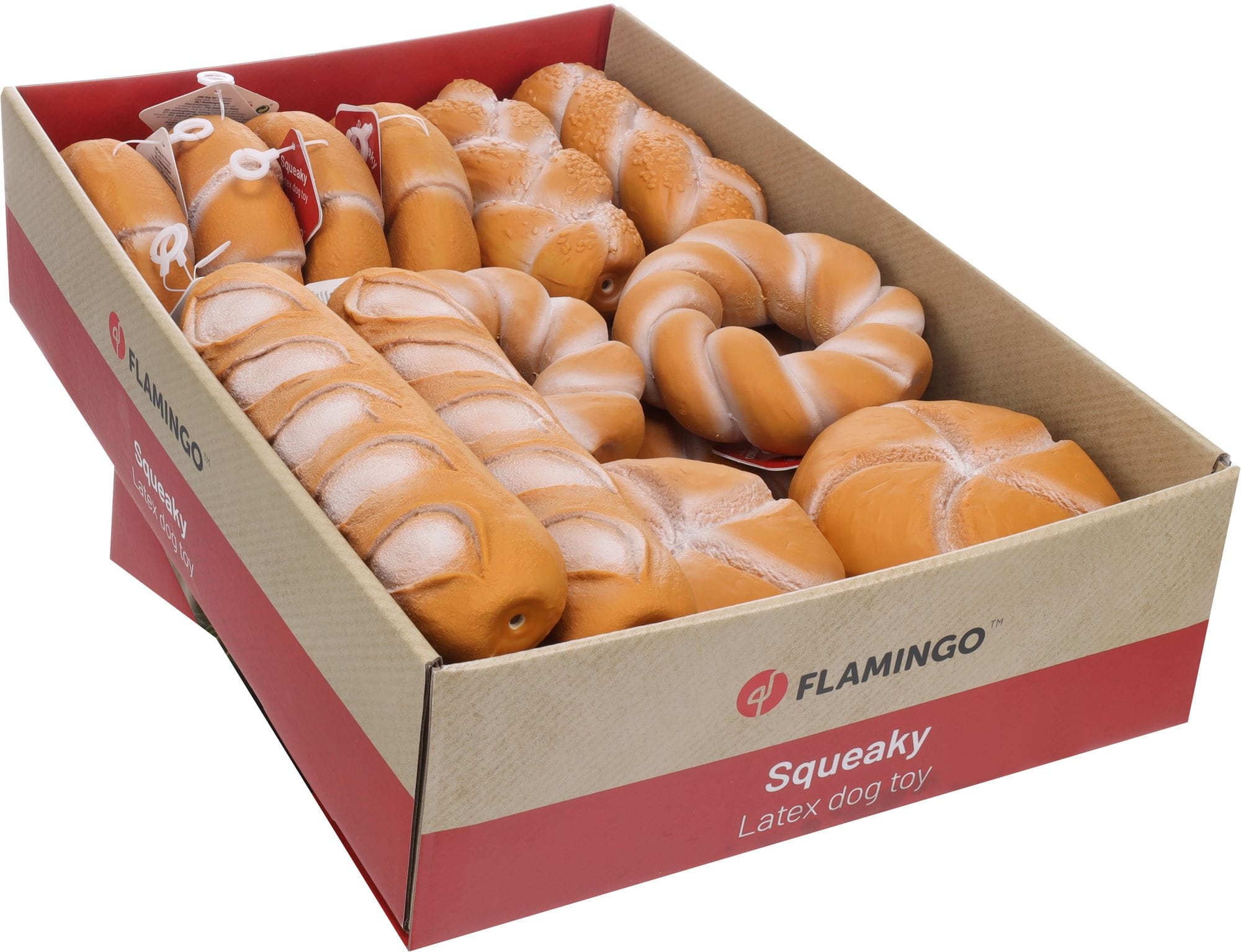 Belgijska marka Flamingo w swojej ofercie posiada szeroki wybór akcesoriów dla psów i kotów. Dużym zainteresowaniem cieszą się m.in. zabawki, które sprawiają zwierzakowi wiele frajdy. Odkryj świat Flamingo już teraz. Zapraszamy do wspólnej zabawy! Zabawka dla psa w kształcie pieczywa* wykonana została z miękkiego lateksu. W jej środku kryje się bardzo nietypowa niespodzianka (jeśli mowa o pieczywie :)) piszczałka, która zachęci do długich chwil aktywności. Zabawkowy smakołyk poleca się do zabrania w plener lub wspólną podróż. Aportowanie pieczywem to świetna forma rozrywki dla pupila.   Pamiętaj, nie ma zabawek niezniszczalnych. Zabawki dobieramy pod charakter i temperament pupila. Produkt nie do spożycia! Zabawa zawsze powinna odbywać się pod nadzorem właściciela.   Materiał: lateks Z piszczałką dla dodatkowej zabawy Nieodpowiednie dla: Dzieci poniżej 3 roku życia Wypełnienie: Tkanina poliestrowa Odporność na warunki atmosferyczne/wodę/IP: Tak Typ odporność na warunki atmosferyczne/wodę/IP: Odporny na zachlapania Certyfikaty: CE EN71 +3 lata