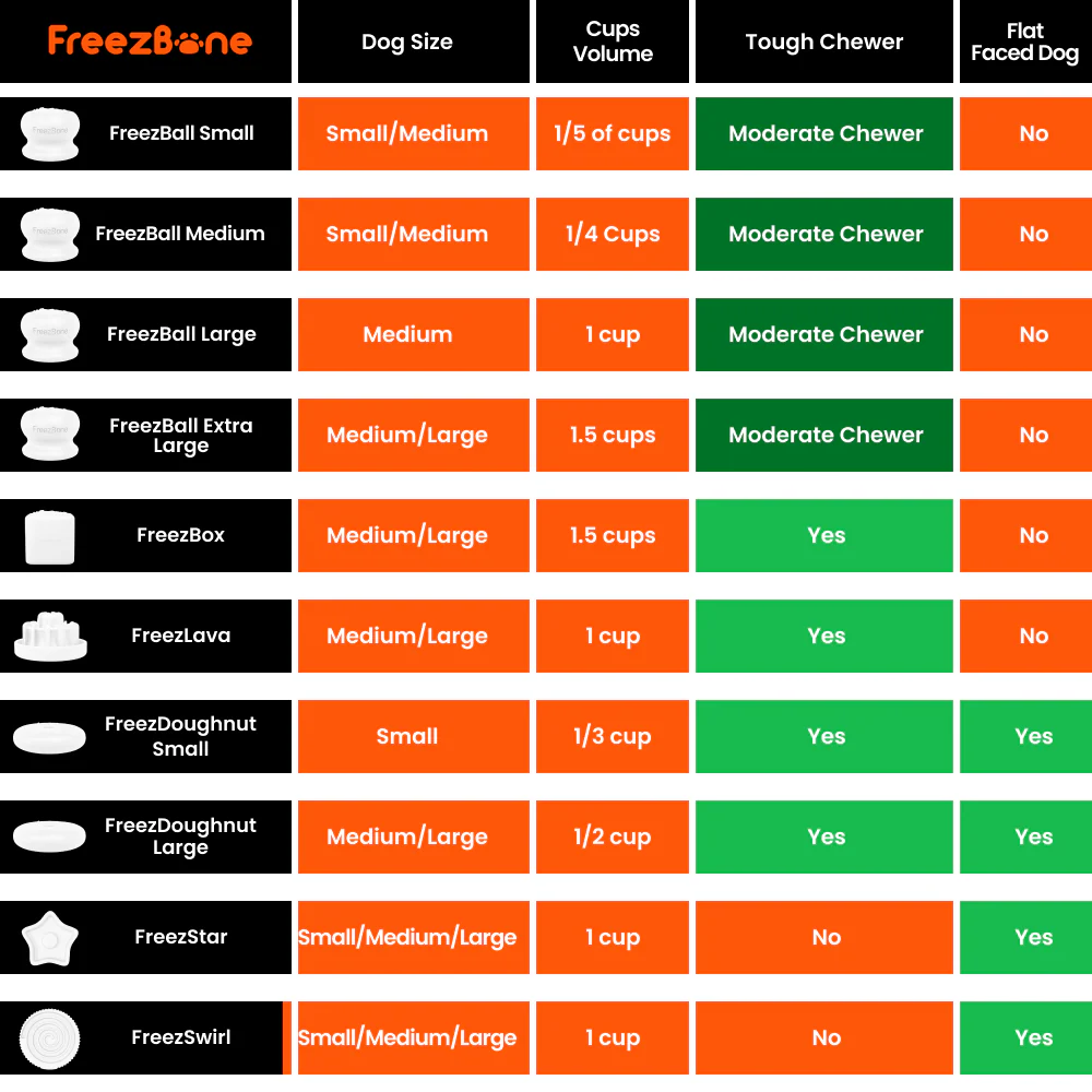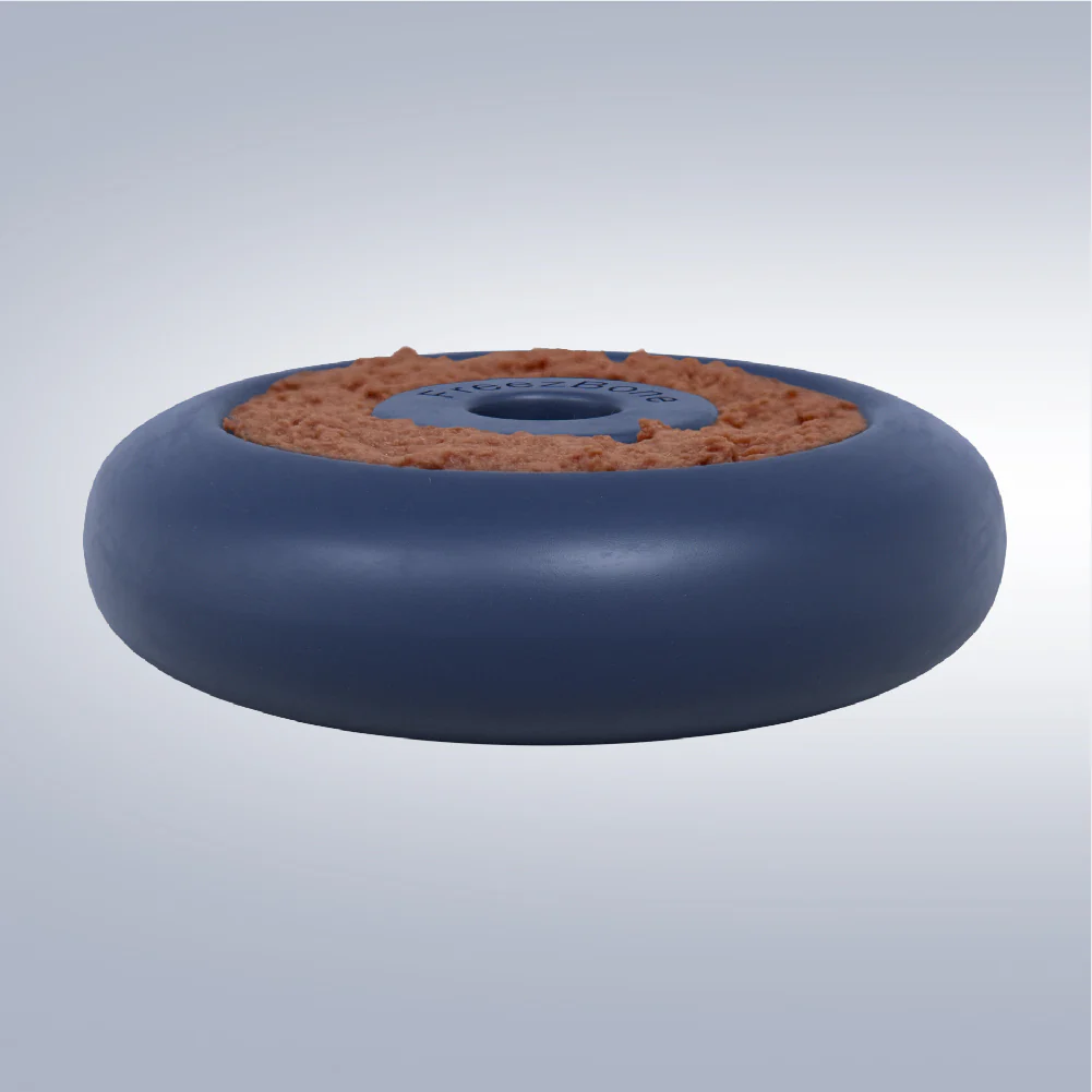 Solidna zabawka dla psów z najsilniejszymi szczękami, wykonana z trwałych materiałów i zaprojektowana tak, by wytrzymać nawet najbardziej intensywne żucie. Kształtem przypomina pączka – smakołyk, który każdy kocha, i szybko stanie się ulubioną zabawką Twojego psa. Personalizuj ją, wybierając własne wypełnienie. Zamroź i pozwól swojemu pupilowi cieszyć się nawet do 45 minut radosnego żucia! Rozmiary: Mały – dla psów do 32 kg Duży – dla psów do 63 kg Przyjazna dla środowiska i bezpieczna Wykonana w 100% z naturalnego kauczuku, Freez Doughnut jest nietoksyczna, biodegradowalna i bezpieczna dla Twojego pupila oraz planety. To ekologiczny wybór, który zapewnia satysfakcjonujące i trwałe żucie. Polecana przez weterynarzy Wielu weterynarzy z całego kraju poleca Freez Doughnut jako idealne rozwiązanie dla właścicieli psów z intensywnym instynktem żucia. Zabawka odciąga uwagę od niepożądanych nawyków i chroni dom przed zniszczeniami. Łatwa w utrzymaniu czystości Naturalny kauczuk sprawia, że zabawkę można myć w zmywarce. Wystarczy włożyć do zmywarki, napełnić ulubionym wypełnieniem psa, zamrozić i gotowe na kolejną rundę zabawy!   Instrukcja użytkowania: Krok 1: Weź pusty, oficjalny Freez Doughnut. Krok 2: Otwórz torebkę z wypełnieniem i wlej zawartość do Freez Doughnut. Krok 3: Zamroź, aby uzyskać długotrwałą przekąskę. WAŻNE: Po otwarciu przechowuj wypełnienia w lodówce. Zabawki Freezbone najlepiej sprawdza się u umiarkowanych żujących psów, a każdy pies bawi się z nim inaczej. Ponieważ zabawki różnią się trwałością, zawsze obserwuj swojego pupila podczas zabawy, szczególnie gdy jest intensywna. Nadzorowana zabawa wydłuża żywotność zabawki i przede wszystkim zapewnia bezpieczeństwo Twojemu psu. Żadna zabawka nie jest niezniszczalna – jeśli zauważysz uszkodzenia, natychmiast ją wymień.