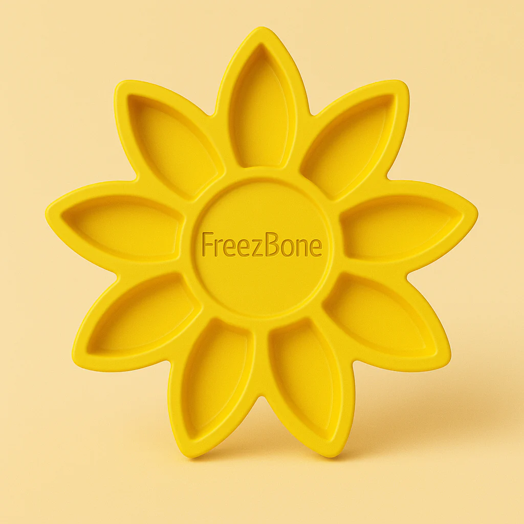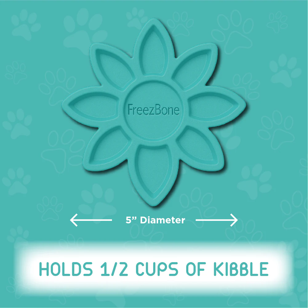 Przedstawiamy FreezFlower, unikalną zabawkę wzbogacającą zabawę, inspirowaną naturalnym pięknem kwitnącego kwiatu. Rowki w kształcie płatków zostały starannie zaprojektowane tak, by pomieścić do ¾ szklanki suchej karmy lub ulubionych wypełnień Twojego psa, tworząc zabawną i angażującą mrożoną przekąskę, którą Twój pupil pokocha. Wystarczy napełnić, zamrozić i obserwować, jak pies delektuje się powolnym jedzeniem, zachęcającym do lizania, żucia i spokojnej, skoncentrowanej zabawy. Rozmiar: FreezFlower ma średnicę 12,7 cm i jest odpowiednio dopasowany dla psów wszystkich ras i rozmiarów, w tym psów brachycefalicznych, co sprawia, że nadaje się dla zwierząt ważących do 63 kg. Innowacyjny design: Misternie zaprojektowane rowki kwiatowe nie tylko ładnie wyglądają, lecz także wydłużają czas posiłku psa i stymulują jego umysł oraz szczękę. Ten interaktywny kształt wspiera naturalne zachowania lizania, co pomaga zmniejszyć stres i lęk, utrzymując psa spokojnym i zadowolonym. Przyjazny środowisku i bezpieczny dla zwierząt: Wykonany w 100% z naturalnego kauczuku, FreezFlower jest nietoksyczny, biodegradowalny i bezpieczny dla Twojego pupila oraz środowiska. To ekologiczny wybór, który zapewnia psu satysfakcjonującą i trwałą zabawę. Polecany przez weterynarzy: Wielu weterynarzy z całego kraju poleca FreezFlower jako idealne rozwiązanie dla właścicieli psów, które chętnie i intensywnie żują. Zabawka nie tylko odciąga uwagę od niepożądanych nawyków żucia, ale także chroni dom przed uszkodzeniami, dając radość zwierzęciu. Łatwe mycie: Dzięki naturalnemu kauczukowi FreezFlower łatwo utrzymać w czystości — można ją bezpiecznie myć w zmywarce. Wystarczy włożyć do zmywarki, napełnić ulubionym wypełnieniem psa, zamrozić i gotowe na kolejną rundę zabawy! Zasady podawania: FreezFlower jest przeznaczony do uzupełniającego karmienia i można go używać codziennie, w połączeniu z pełnowartościową i zbilansowaną dietą psa. Stosując własne przepisy, dostosuj całkowitą dzienną porcję jedzenia psa, aby zapewnić stałą kaloryczność. Instrukcja przygotowania: Jak przygotować idealną mrożoną przekąskę FreezFlower: Krok 1: Weź pusty FreezFlower i postaw go na płaskiej powierzchni. Krok 2: Wlej wybrany wypełnienie dopasowany do diety psa. Krok 3: Zamroź na kilka godzin lub na noc. Gdy przysmak będzie całkowicie zamrożony, podaj go psu na długotrwałą i satysfakcjonującą zabawę. WAŻNE: Po otwarciu przechowuj wypełnienia w lodówce, aby zachować świeżość. Freezbone najlepiej sprawdza się u umiarkowanych żujących psów, a każdy pies bawi się z nim inaczej. Ponieważ zabawki różnią się trwałością, zawsze obserwuj swojego pupila podczas zabawy, zwłaszcza gdy jest intensywna. Nadzorowana zabawa wydłuża żywotność zabawki i przede wszystkim zapewnia bezpieczeństwo Twojemu psu. Żadna zabawka nie jest niezniszczalna – jeśli zauważysz uszkodzenia, natychmiast ją wymień. .
