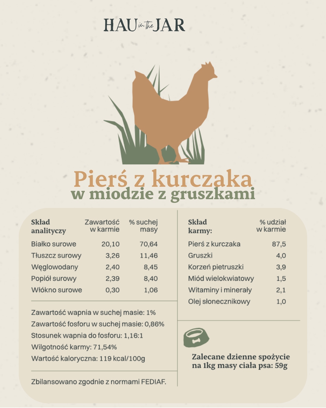 Skład: piersi z kurczaka 87,5%, gruszki 4,0%, korzeń pietruszki 3,9%, miód wielokwiatowy 1,5%, witaminy i minerały 2,1%, olej słonecznikowy 1,0%. Wilgotność karmy: 71,54% Składniki analityczne: białko surowe 20,1%, tłuszcz surowy 3,26%, węglowodany 2,4%, popiół surowy 2,39%, włókno surowe 0,3%. Składniki analityczne w suchej masie: białko surowe 70,64%, tłuszcz surowy 11,46%, węglowodany 8,45%, popiół surowy 8,4%, włókno surowe 1,06%. Wartość energetyczna w 100g: 119 kcal Zawartość wapnia w suchej masie: 1% Zawartość fosforu w suchej masie: 0,86% Stosunek wapnia do fosforu: 1,16:1,0 Witaminy i minerały (udział w suchej masie):Potas 1,06%; Sód 0,46%; Magnez 0,16%; Chlor 0,52%; Żelazo 83,7mg/kg; Miedź 15,1mg/kg, Mangan 9,5mg/kg; Cynk 150,6mg/kg; Jod 1,5mg/kg; Selen 0,7mg/kg; Wit. A 18326,6iu/kg;  Wit. C 202,3mg/kg; Wit. D 1129,3iu/kg; Wit. E 58,8iu/kg; B1 7,6mg/kg; B2 10,6mg/kg; B3 302,7mg/kg; B5 43,5mg/kg; B6 12,2mg/kg; B12 0,02mg/kg; Kwas foliowy 1,1mg/kg; Cholina 2781,6mg/kg; Wit. K1 2,3mg/kg; Biotyna 0,3mg/kg. Zbilansowano zgodnie z normami FEDIAF (z 2025r). Sposób karmienia: Wprowadź karmę stopniowo, obserwując reakcję psa i dostosowując ilość posiłku do jego indywidualnych potrzeb. Podawaj ją w temperaturze pokojowej, a obok zawsze zapewnij świeżą wodę do picia. Rosołek ze słoika możesz wykorzystać także do polania suchej karmy. Jeśli chcesz zobaczyć jak powstaje karma i dowiedzieć się więcej o mnie i produkcji zapraszam na Instagram Hau in the Jar.