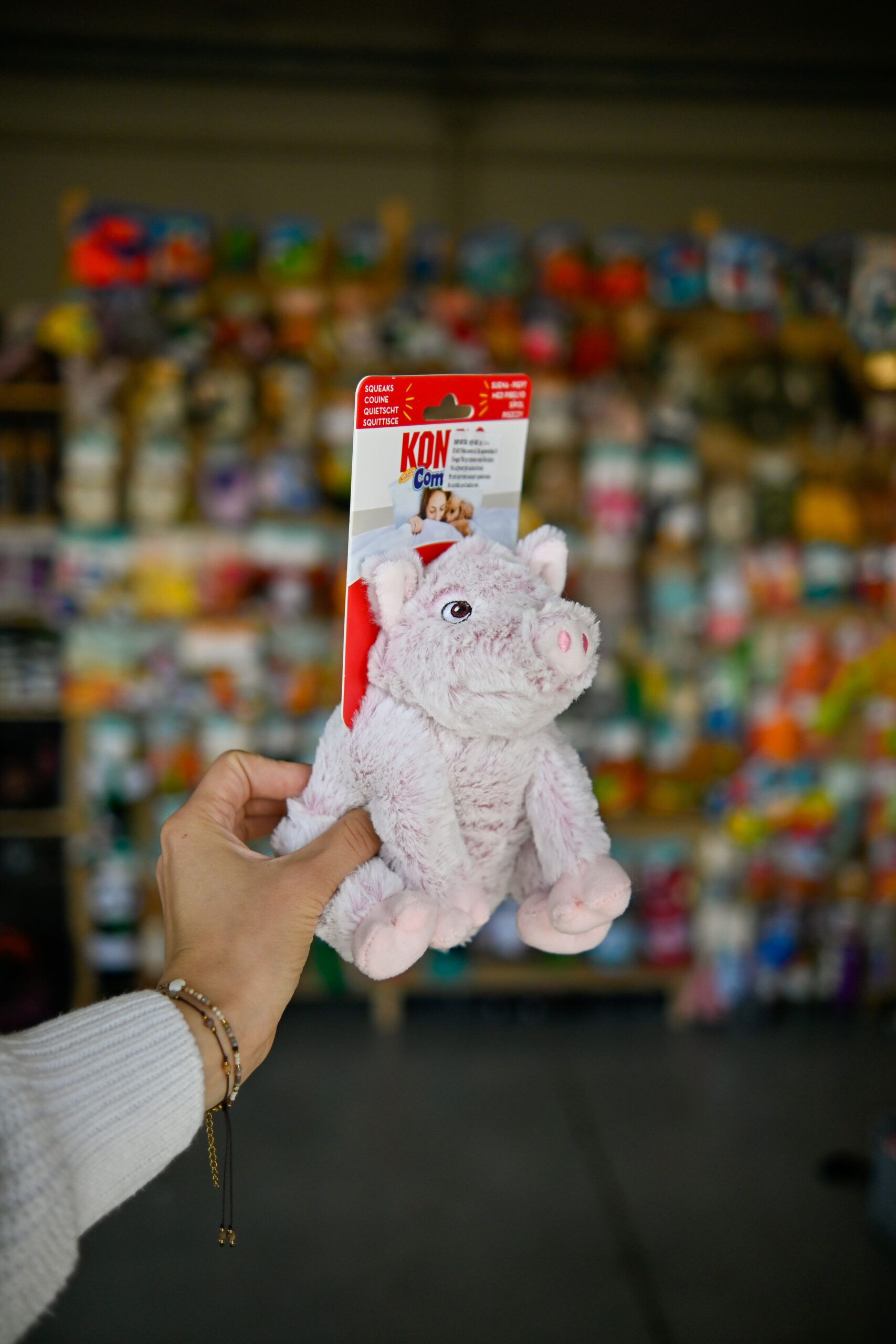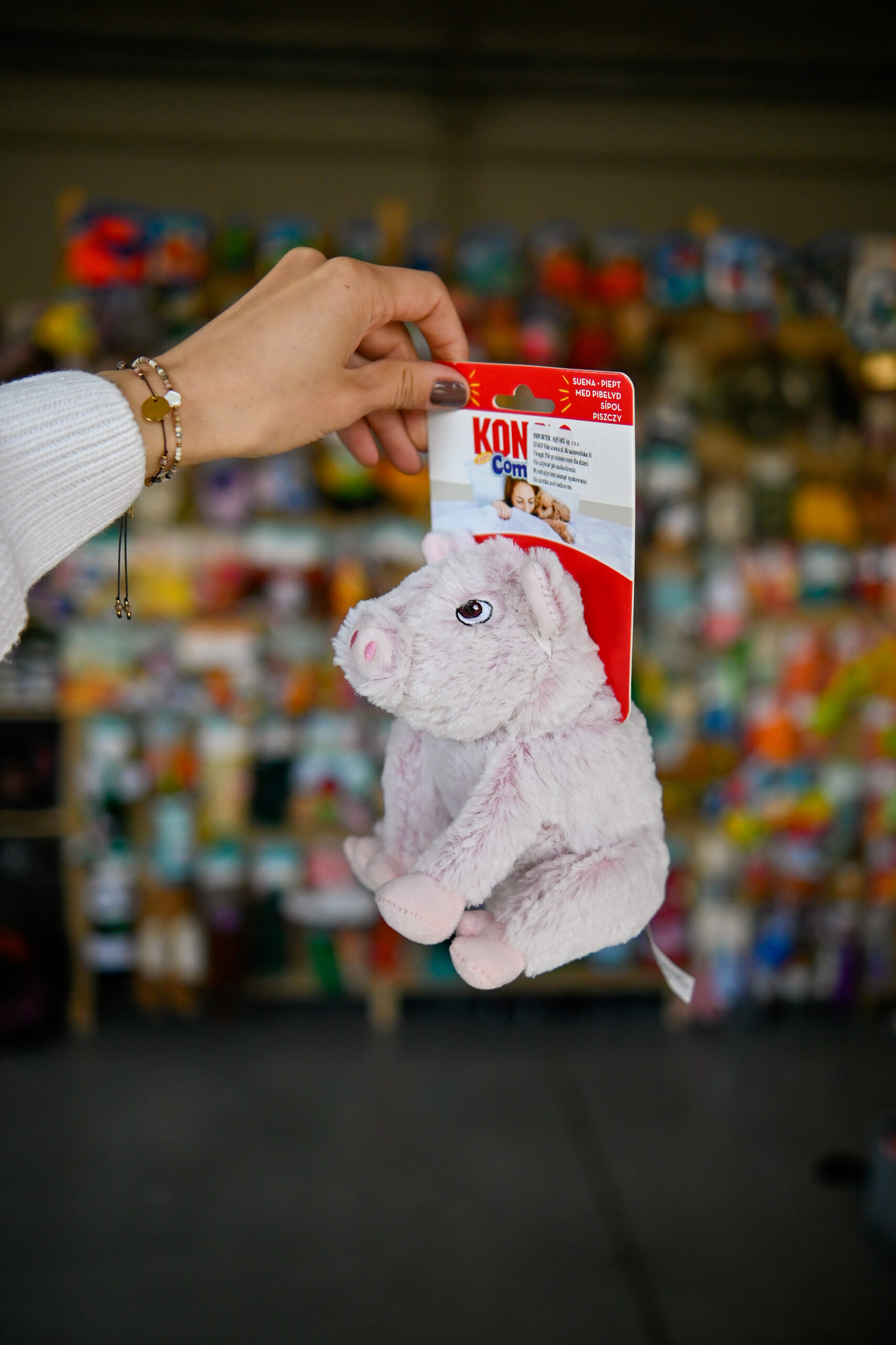 KONG COMFORT KIDDOS PIG SM  KONG Comfort Kiddos Pig Small to urocza pluszowa zabawka w kształcie różowej świnki, która zapewnia psom przyjemną i bezpieczną rozrywkę. Miękka konstrukcja sprawia, że jest idealna do przytulania, a wbudowana piszczałka dodaje atrakcyjności podczas zabawy. Ta zabawka łączy w sobie komfort i interaktywność, zaspokajając różnorodne potrzeby psów.  Główne zalety produktu KONG Comfort Kiddos Pig Small: