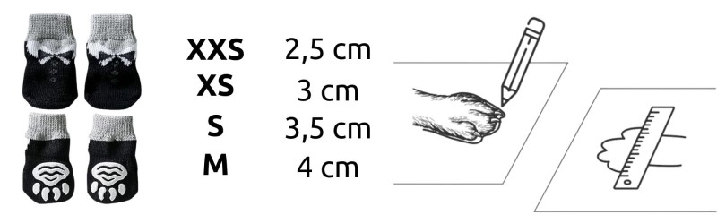 UWAGA: Aby skarpetka dobrze pasowała, rozmiar powinien być minimalnie mniejszy od rzeczywistego rozmiaru łapy. Wszystkie rozmiary są mierzone na płasko. Ze względu na elastyczność dzianin mogą występować niewielkie błędy. Aby najlepiej ustalić rozmiar należy podłożyć kartkę i zaczekać, aż pies swobodnie na niej stanie, a następnie odrysować psią łapę podczas obciążenia i zmierzyć linijką w najszerszym punkcie. Wybierając buty dla psa kierujemy się wyłącznie
