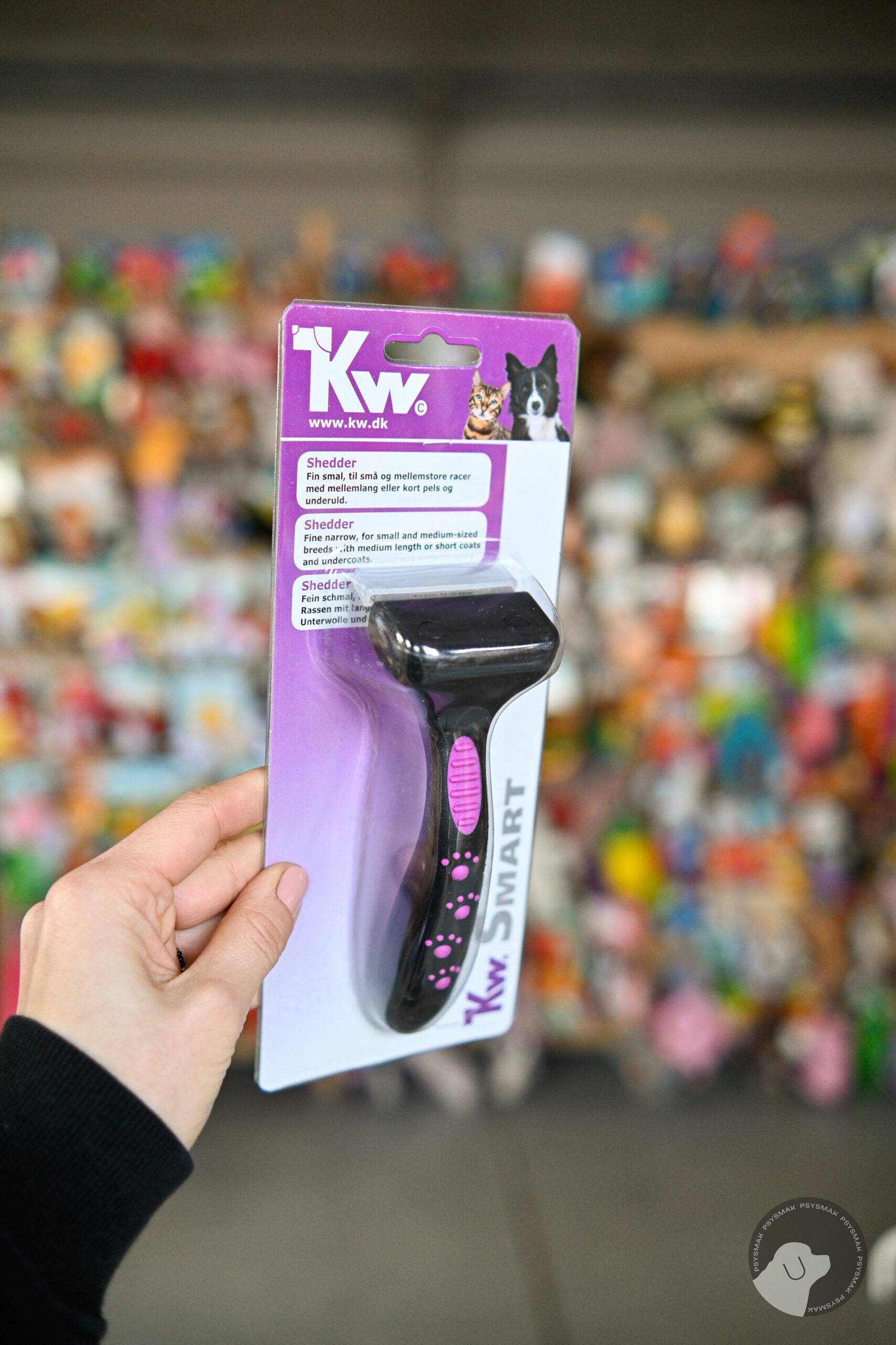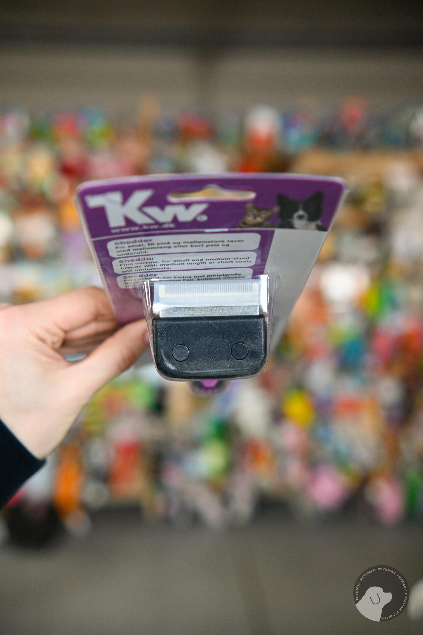 Eliminator do krótkiej sierści psa i kota, KW Smart Shedder Fine Narrow. Doskonale usuwa luźny włos i podszerstek. Redukuje wypadanie sierści. Niezastąpiony o okresach linienia. Używany regularnie u ras z tendencją do gubienia włosów pomaga pozbyć się problemu fruwających po domu kłębków, a u kotów powstawania kul włosowych w przewodzie pokarmowym. Eliminator do sierści działa na zasadzie normalnej szczotki: podczas czesania metalowe „ostrze” ze stali nierdzewnej, z gęsto rozstawionymi zębami, zatopione w plastiku doskonale usuwa martwy włos, podszerstek i większe zanieczyszczania np. drobinki piasku. Blokada po bokach ostrza chroni przed przypadkowym wbiciem ząbków ostrza w skórę, a co za tym idzie nie ma ryzyka skaleczenia jej. Wygodny antypoślizgowy uchwyt, dostosowany do kształtu dłoni zapewnia wygodną pracę. Wymiary: