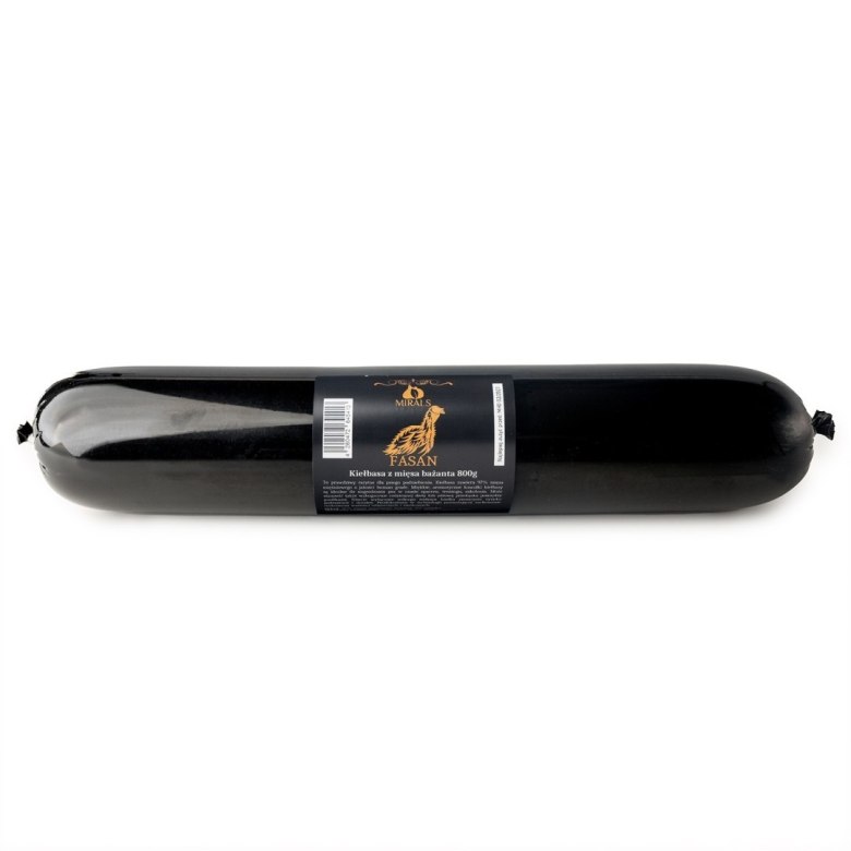 To prawdziwy rarytas dla psiego podniebienia. Kiełbasa zawiera  97% mięsa mięśniowego bażanta o jakości human grade. Mięso bażanta  jest źródłem pełnowartościowego białka, bogatego w aminokwasy egzogenne. Jest bogate w składniki mineralne jak fosfor, magnez i żelazo. Dostarcza także cennych witamin, wpływających na kondycję mięśni, ciśnienie krwi, pracę serca, układ nerwowy i mózg. Mięso bażanta  jest bardzo zdrowe i dobrze tolerowane przez większość psów z nadwrażliwością pokarmową, dlatego szczególnie polecane jest psom z wrażliwym układem pokarmowym i alergikom.