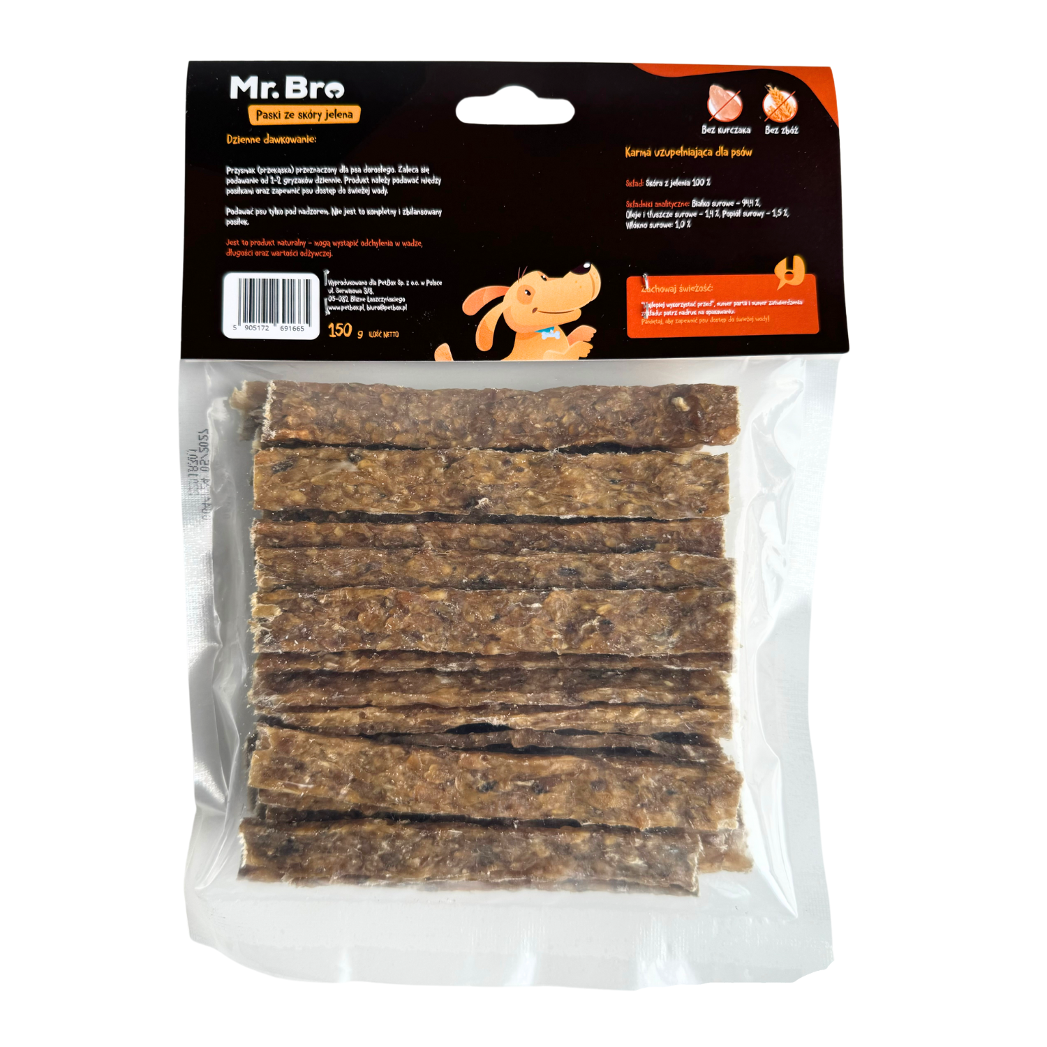 Nasze Suszone Paski z Jelenia to idealny sposób na nagrodzenie i rozpieszczenie Twojego psa, dbając jednocześnie o jego zdrowie i szczęście. Spróbuj już dziś i przekonaj się, jak wiele radości mogą przynieść te pyszne, naturalne przekąski!       Skład: