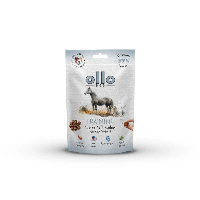Ollo Air-Dried Horse Soft Training Cubes to naturalne przysmaki dla psa z 99% koniny, idealne jako nagroda podczas treningów i spacerów. Dzięki monobiałkowej formule i delikatnemu suszeniu powietrzem, zachowują maksimum wartości odżywczych i smakowych, będąc jednocześnie hipoalergiczną propozycją nawet dla najbardziej wrażliwych psów. Miękkie kostki o wymiarach ok. 10 mm są idealne dla psów wszystkich ras i w każdym wieku – od szczeniąt po seniorów.