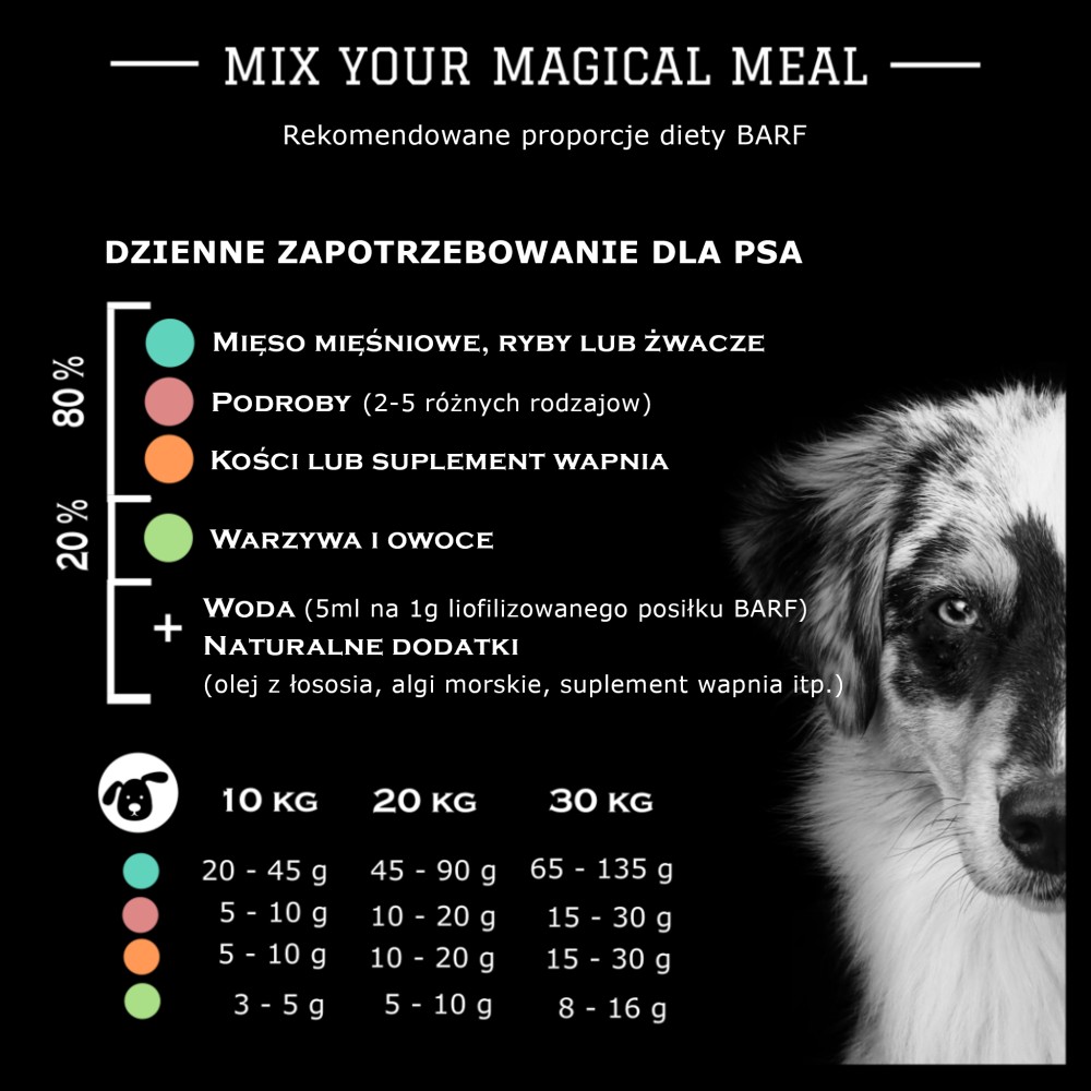 Wymieszaj wszystkie składniki (niebieskie, czerwone, żółte i zielone) z naturalnymi dodatkami w zależności od potrzeb na kilka dni. Z tej ilości można codziennie wyjąć porcję i przygotować na świeżo z wodą, olejem, algami morskimi i suplementami. Na jedną część przypadają 4 porcje wody zimnej lub letniej. Po około 5-10 minutach posiłek jest wilgotny i gotowy do podania. Przelicznik: Surowa ilość produktów mięsnych/5= ilość liofilizowana Surowa ilość produktów roślinnych/15= ilość liofilizowana