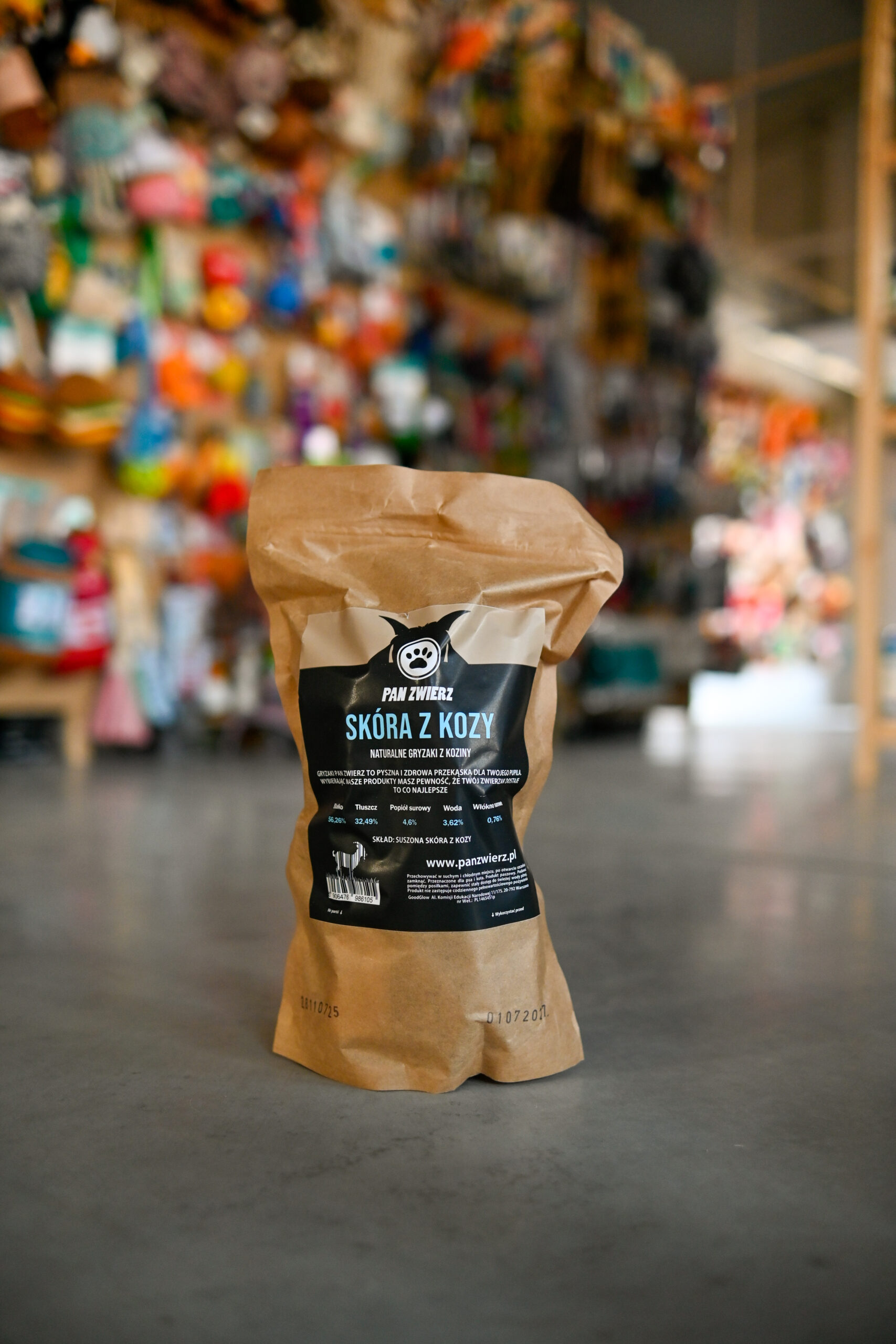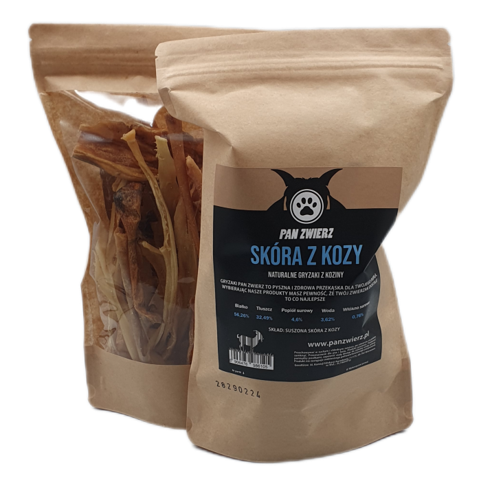 Skład: 100% Skóra kozy Składniki analityczne: białko 56,26%, tłuszcz 32,49%, woda 3,62%, popiół surowy 4,6%, włókno surowe 0,76% Opakowanie 250 g. Skóra kozy to naturalny gryzak o bardzo intensywnym zapachu i średniej twardości. Zawiera dużą ilość białka, przy niskiej zawartości tłuszczu. Ponadto skóra z kozy nie pęka i nie kruszy się. Ze względu na swoją hipoalergiczność skóra kozy to doskonała przekąska dla psów o wrażliwym przewodzie pokarmowym czy ze skłonnością do alergii pokarmowych. Przekąska ta jest także pomocna w czyszczeniu zębów z płytki nazębnej i pomaga utrzymać uzębienie w doskonałym stanie. Rekomendujemy skórę kozy szczególnie psom z alergią pokarmową, a także psiakom, które dosyć szybko i łapczywie zjadają gryzaki, ponieważ nawet w przypadku gdy pies szybko i łakomie połknie większe kawałki skóry, te rozmiękną w żołądku, nie sprawiając problemów w trawieniu. Polecany również psom, które po prostu kochają gryźć!   Gryzak jest w 100% naturalny, monobiałkowy – posiada naturalny kolor, smak oraz zapach. Bez dodatku: zbóż, glutenu, konserwantów, wypełniaczy, wzmacniaczy smaku. Gryzak wyprodukowany w Polsce na bazie wyłącznie naturalnego surowca. Gryzak zapakowane w papierową torebkę z wielokrotnym zamknięciem strunowym ZIP. Dla utrzymania świeżości pamiętaj, aby opakowanie było szczelnie zamknięte. Opakowanie z przysmakami przechowuj w suchym miejscu w temperaturze pokojowej. Zapewnij również swojemu psu dostęp do świeżej wody.   Wszystkie przysmaki i gryzaki, które znajdują się w naszej ofercie są w 100% naturalne i suszone – dzięki temu zachowują swój wyjątkowy charakter i wszystkie cenne wartości odżywcze.