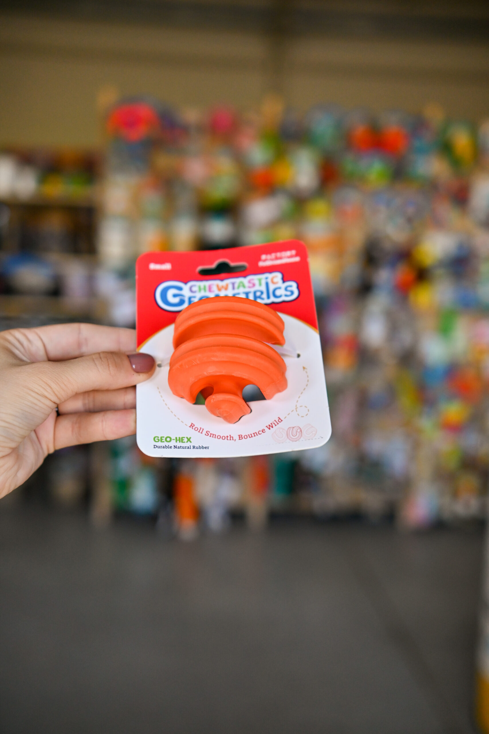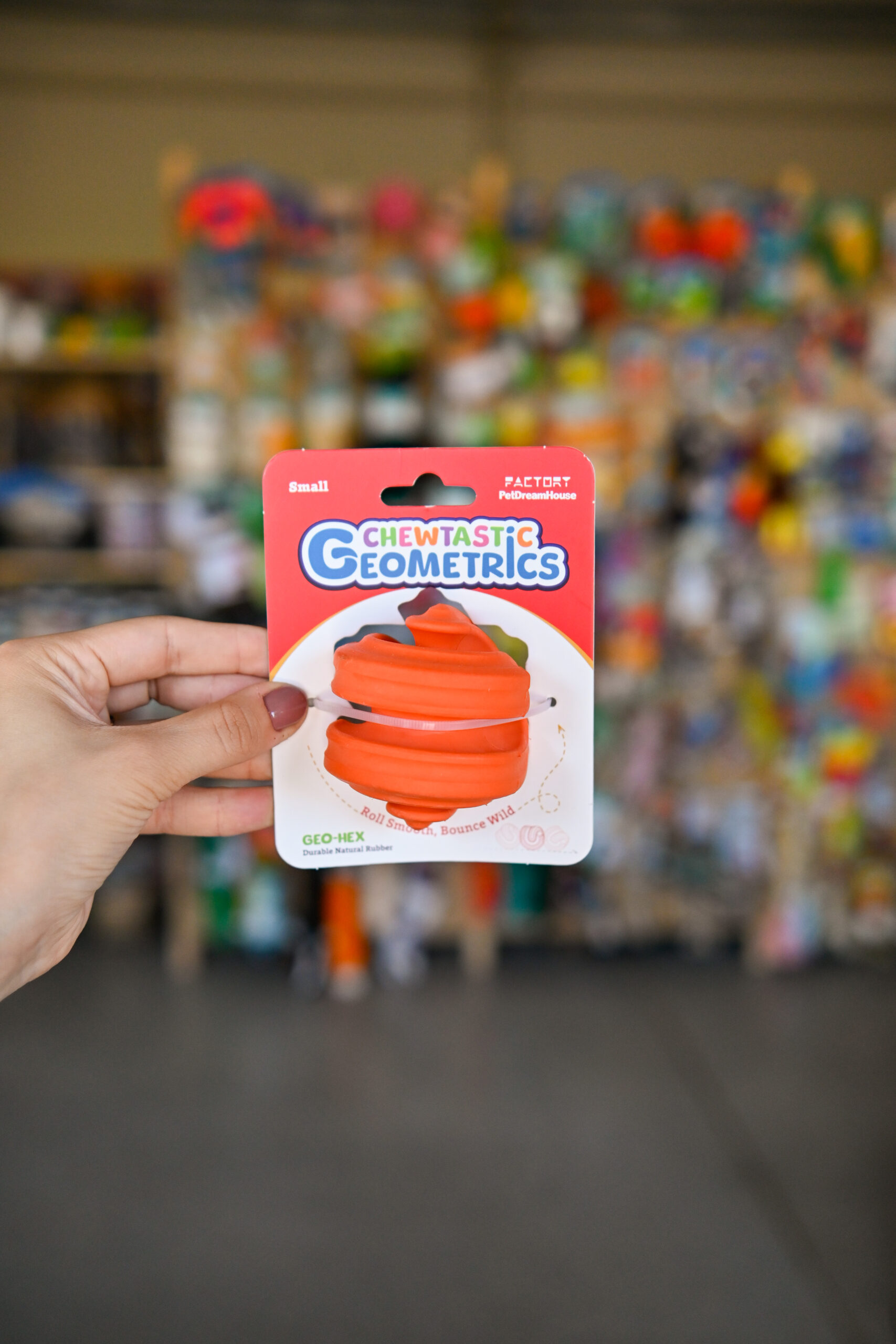 Zabawki z linii geometrycznej jednej z najbardziej popularnych firm w psim świecie to przeróżne kształty, wykonane z bezpiecznego, nietoksycznego, gumowego materiału, które zapewniają długą zabawę Twojego pupila. W ich wnętrzu można umieszczać smakołyki, które uatrakcyjnią zabawę, a za sprawą asymetrycznych kształtów, dzięki którym zabawka przemieszcza się w nieprzewidywalny dla psa sposób, zaspokoją potrzebę pogoni.