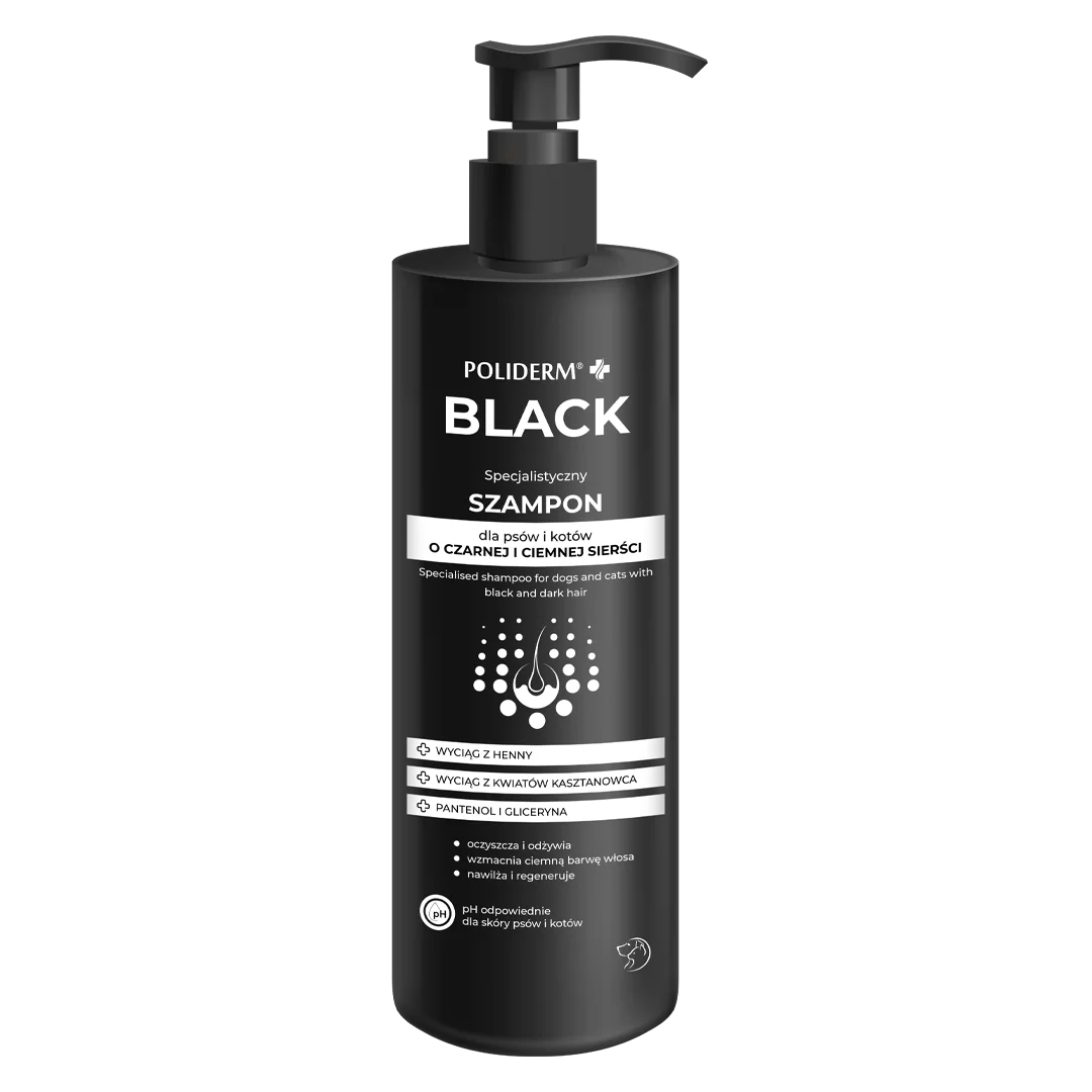 POLIDERM® BLACK szampon służy do pielęgnacji sierści, utrzymania jej w dobrej kondycji. Po kąpieli sierść jest odżywiona i jedwabista w dotyku. Szampon pielęgnacyjny oczyszcza, podkreśla kolor włosa, jak również usuwa nieprzyjemny zapach.