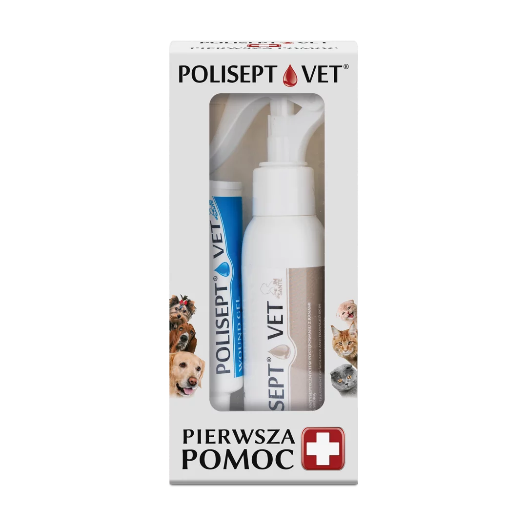 Zestaw POLISEPT VET® – Pierwsza Pomoc zawiera: Polisept Vet® Spray 100 ml spray do dezynfekcji wszelkiego rodzaju ran oraz Polisept Vet® Wound Gel 30 ml aktywny opatrunek w postaci żelu hydrokolidowego do stosowania na rany. Preparaty skutecznie przyspieszają i usprawniają proces gojenia się wszelkich skaleczeń. Zestaw usuwa zanieczyszczenia biologiczne, zwalcza zakażenia bakteryjne oraz hamuje rozwój biofilmu bakteryjnego i zapobiega tworzeniu się blizn. Nasza apteczka dla zwierząt sprawdza się do użytku domowego, a także podczas wycieczek i wyjazdów. Apteczka pierwszej pomocy dla psa i kota pozwoli każdemu właścicielowi szybko opatrzyć i zabezpieczyć ranę. POLISEPT VET® Spray 100ml – zwalcza zakażenia bakteryjne, usuwa biofilm bakteryjny i zapobiega jego powstawaniu. Preparat zwalcza stan zapalny oraz stwarza optymalne warunki dla procesów naprawczych przyspieszając proces gojenia się ran i skaleczeń. POLISEPT® VET® Wound Gel 30ml – przyspiesza i usprawnia proces gojenia się ran zapewniając optymalny bilans wodny w obrębie rany. Oczyszcza rany z zanieczyszczeń biologicznych powstających w trakcie gojenia rany, zabezpiecza skaleczenia przed zakażeniem z zewnątrz i zapobiega tworzeniu się biofilmu bakteryjnego. Apteczka Pierwszej Pomocy dla zwierząt umożliwia natychmiastową reakcję w nagłych przypadkach. Preparaty do Pierwszej Pomocy zabierzesz ze sobą na urlop, na wyjazd i na spacer. Zapewnij swojemu Pupilowi pomoc i miej Apteczkę zawsze pod ręką.