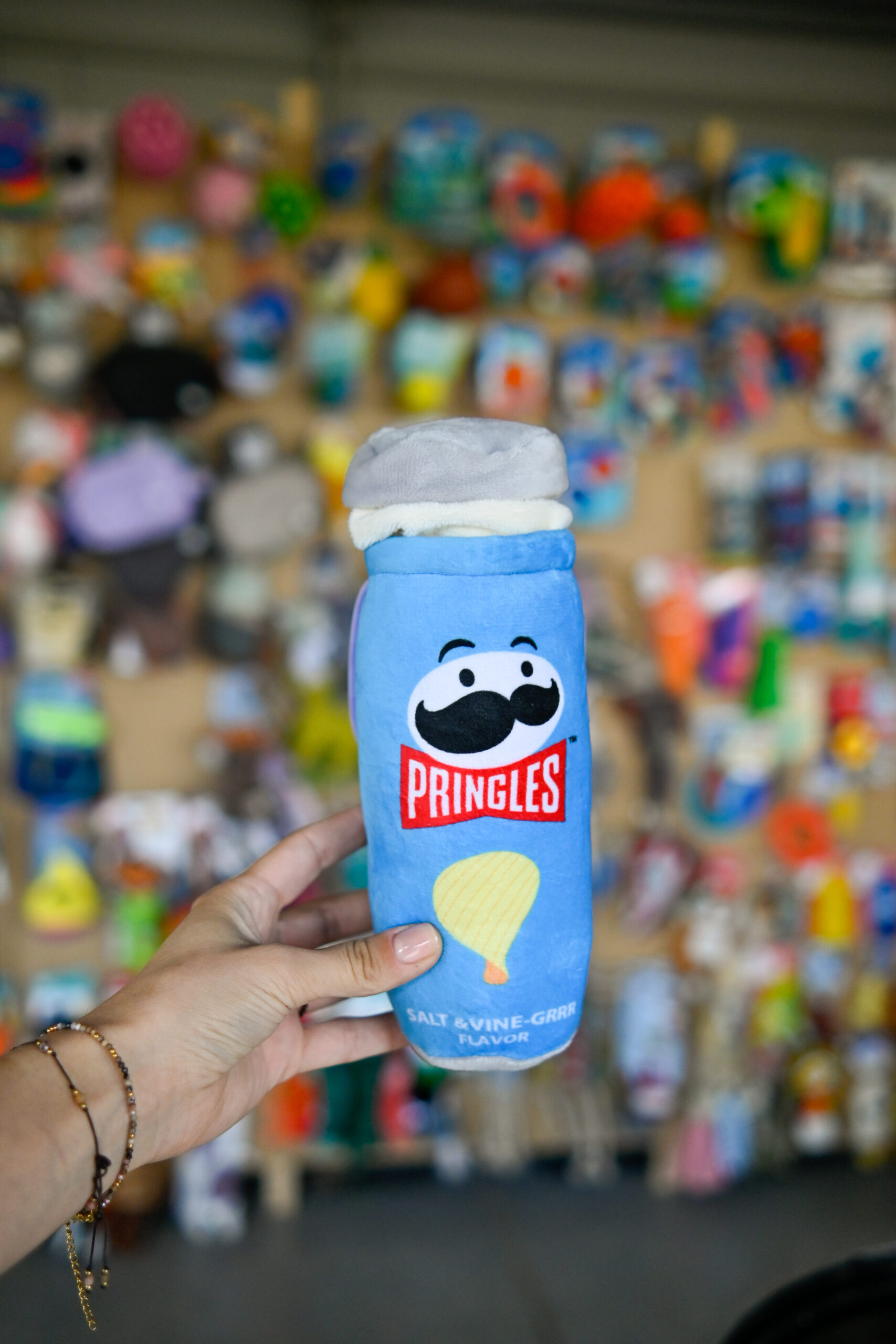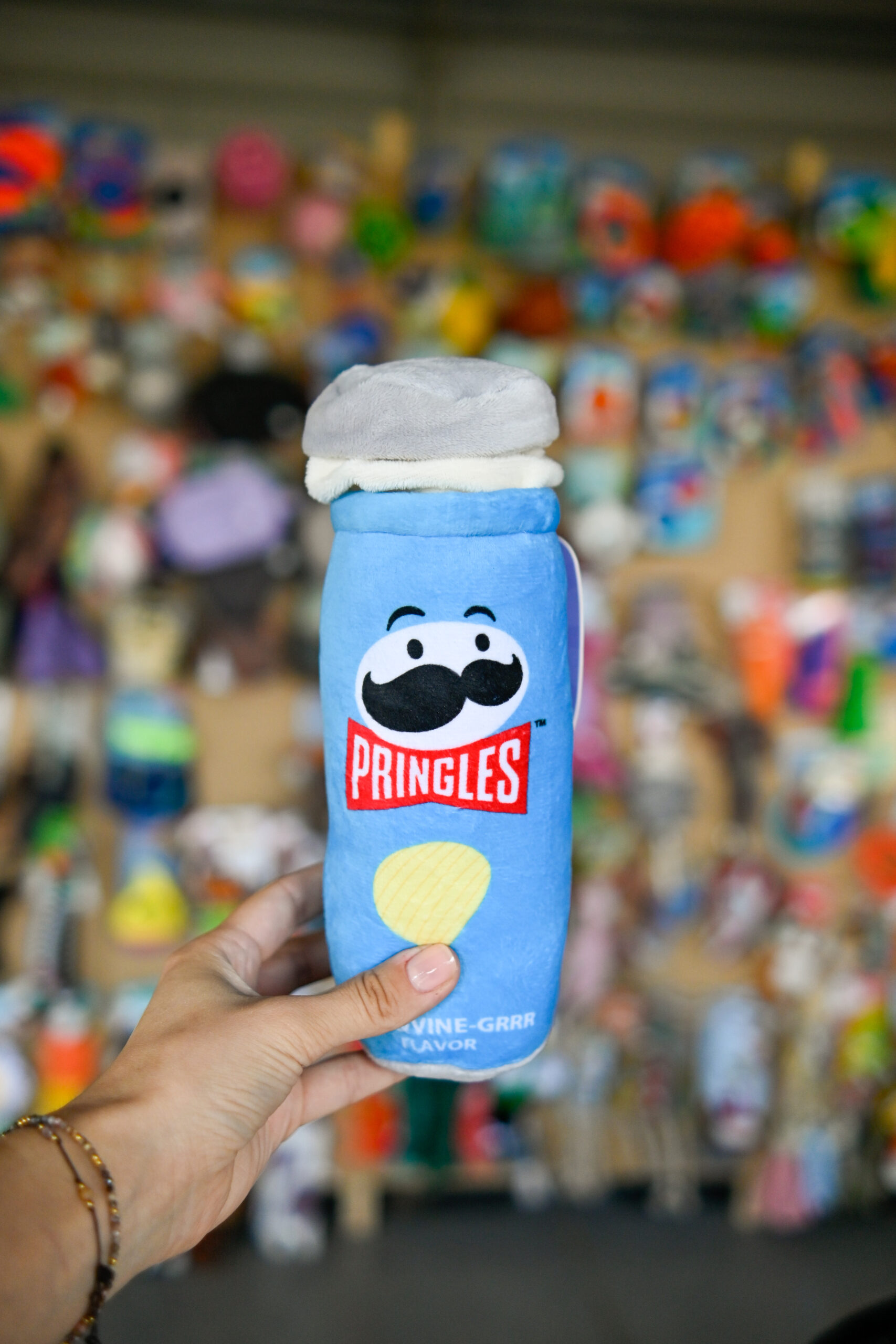 miękka, pluszowa zabawka z piszczałką, w kształcie przypominającym tubę popularnych ziemniaczanych przekąsek Pringles.