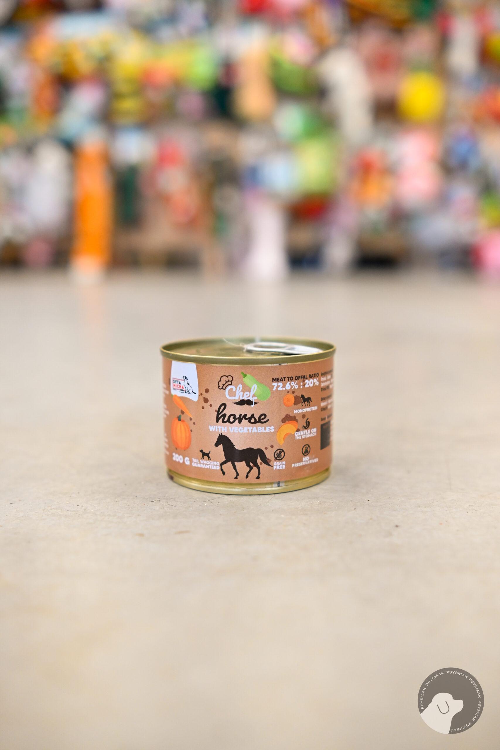 Oprócz mięsa, w karmie mokrej linii Chef koń z warzywami