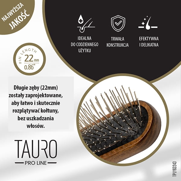 Tauro Pro Line Szczotka groomerska owalna z drewna gruszy, z drewnianymi zębami   Szczotka z drewnianym trzonkiem, owalna, zęby drewniane o długości 16 mm, kolor jasnobrązowy, rozmiar 18,5 x 4,8 cm.   Profesjonalna szczotka drewniana z kolekcji PRESTIGE Tauro Pro Line przeznaczona jest do skutecznej pielęgnacji psów i kotów. Może być używana zarówno przez profesjonalnych groomerów, jak i właścicieli zwierząt, którzy chcą optymalnie zadbać o skórę i sierść swojego pupila.   Włosie i sama szczotka wykonane są z bardzo lekkiego, ale wytrzymałego drewna gruszy. Drewniane piny są specjalnie zaprojektowane do pielęgnacji sierści nawet wrażliwych i alergicznych zwierząt – nie drapią i nie ciągną włosów, zapewniając nieskazitelne rezultaty.   Dzięki specjalnej powłoce antystatycznej włosy nie elektryzują się, sierść jest łatwiejsza do rozczesania oraz pozostaje gładka i lśniąca.   Szczotka jest bardzo lekka, a uchwyt jest ergonomiczny, dzięki czemu wygodnie się ją trzyma: w ten sposób nie nadwyręża się nadgarstka podczas pielęgnacji pupila.   Nadaje się dla psów i kotów wszystkich ras.   Wyprodukowano w Niemczech.       DANE TECHNICZNE:
