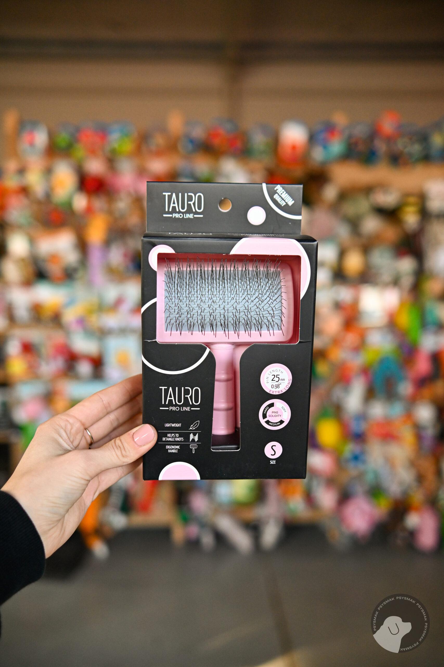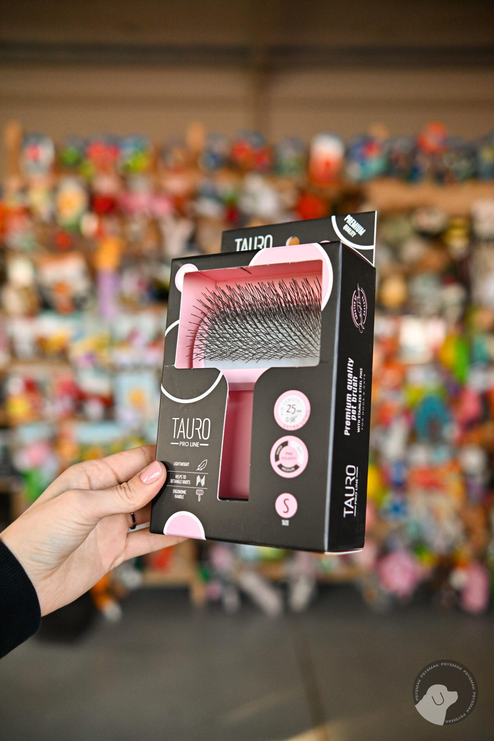 Tauro Pro Line Szczotka groomerska z miękkimi pinami 25mm, rozmiar S – mała   Szczotka z plastikowym trzonkiem, miękkie piny ze stali nierdzewnej, długość 25mm, kolor różowy   Poduszka szczotki jest miękka i elastyczna, delikatnie dopasowuje się do krzywizn ciała zwierzęcia, nie podrażniając skóry.   Ergonomiczny uchwyt jest wygodny w trzymaniu i nie wyślizguje się z dłoni, dzięki czemu nie nadwyrężysz nadgarstka podczas szczotkowania zwierzęcia.   Piny szczotki są trwałe i bardzo miękkie, a ich kąt zakrzywienia zapobiega podrażnianiu skóry zwierzęcia i sprawia, że ​​szczotkowane futro jest miękkie i puszyste. Ponadto, piny są zaprojektowane w taki sposób, aby łatwo się przesuwać i rozplątywać sierść bez łamania włosów.   Szczotka może być używana zarówno przez profesjonalnych groomerów, hodowców, jak i wszystkich właścicieli zwierząt, którzy szanują skórę i sierść swojego pupila.       Właściwości:   Wymiary: 15.5 x 10.2 x 6.2 cm Piny: stal nierdzewna Długość pinów: 25 mm Kolor: różowy