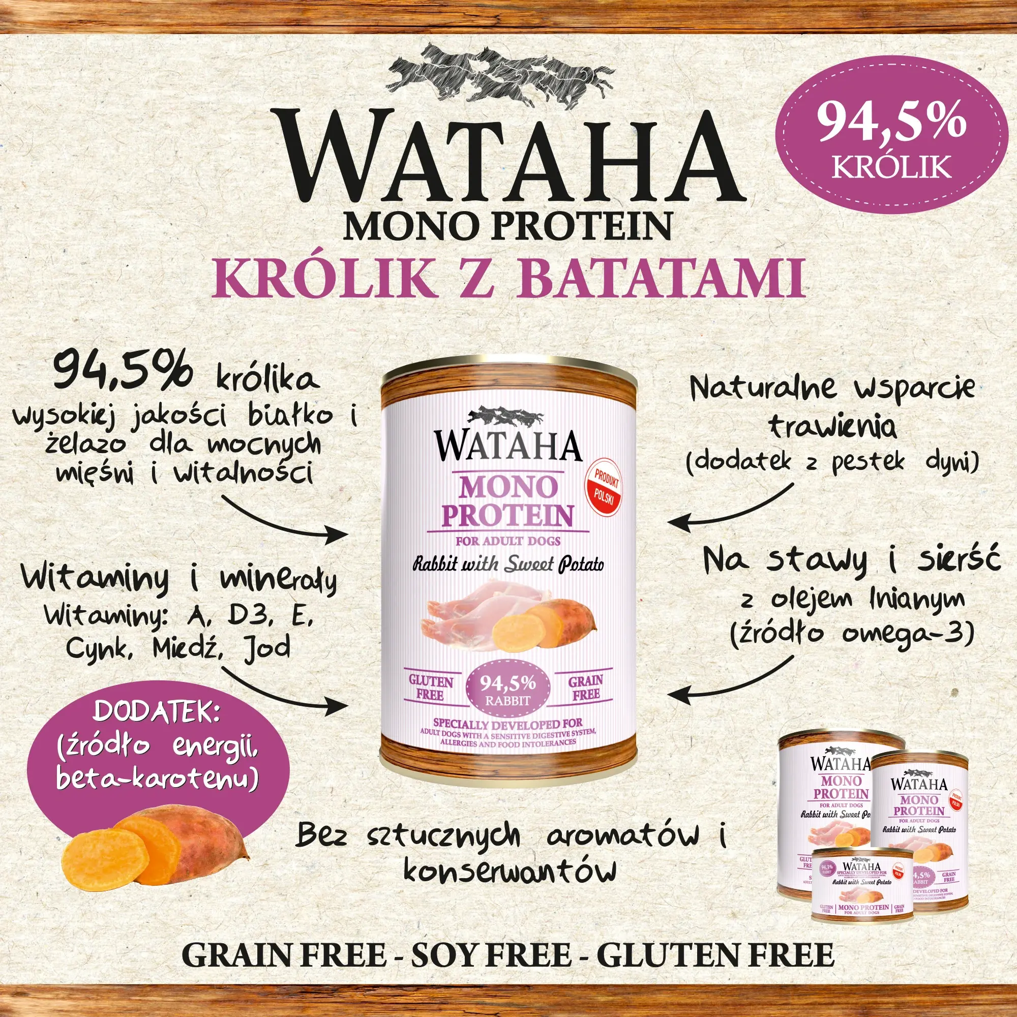 Wataha Mono Protein Adult Królik z Batatami to pełnoporcjowa mokra karma dla dorosłych psów. Powstała z myślą o pupilach z wrażliwym układem trawiennym, zmagających się z alergiami lub nietolerancjami pokarmowymi. Źródło białka stanowi mięso z królika, a bataty dostarczają optymalną dawkę węglowodanów. Karma jest bezzbożowa, nie zawiera glutenu ani soi.